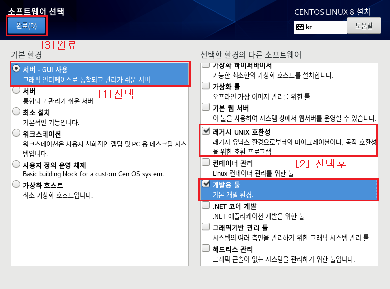 [서버 - GUI 사용]과 [워크스테이션] 둘 다 그놈(GNOME)으로 설치가 됩니다. 다만 서버용으로 설치할 건지 개인 랩탑 및 PC용 데스크톱으로 이용할 건지의 차이라고 생각하면 됩니다. 저는 최소한의 필요한 소프트웨어만 선택해서 진행을 하고 있지만 원하는 소프트웨어를 추가 선택하여 진행하면 됩니다.