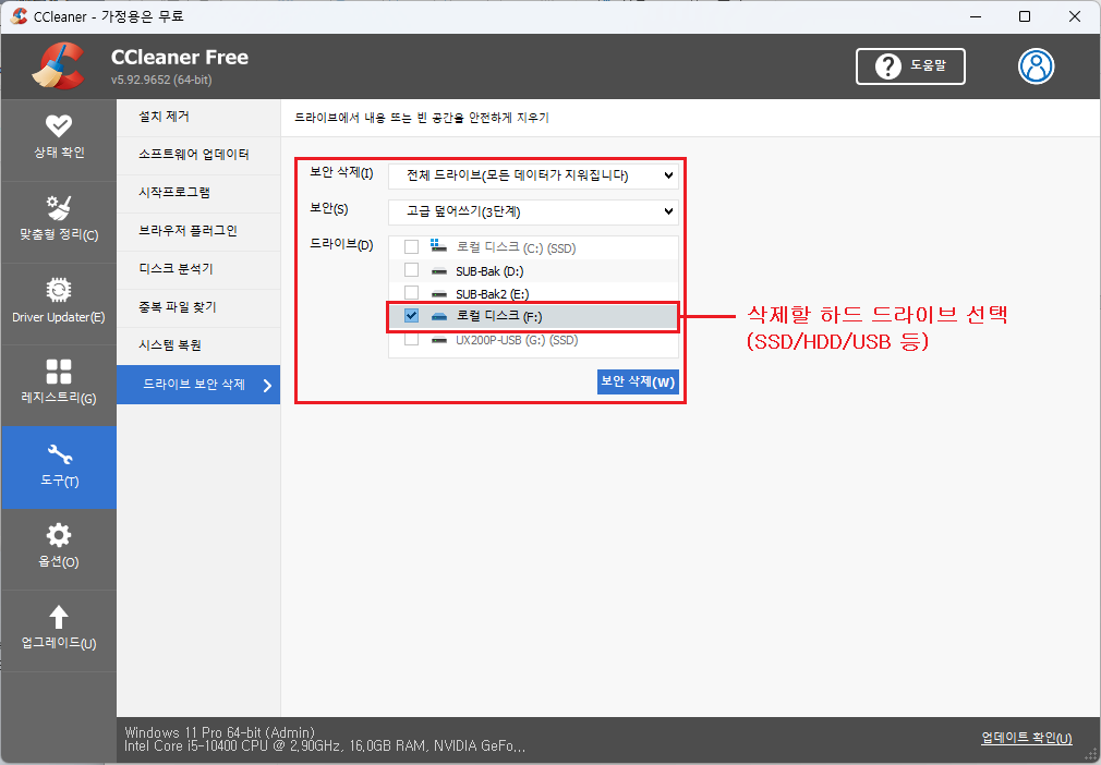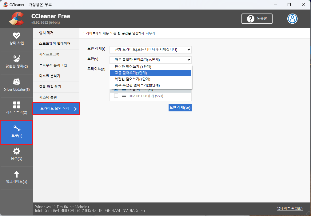 ⑤ 도구 ▷ 드라이브 보안 삭제 선택