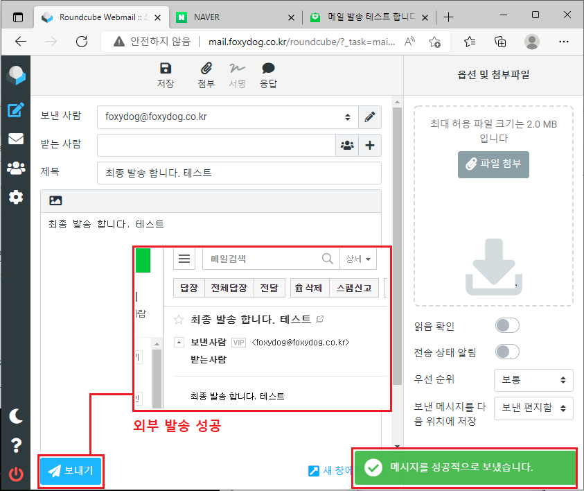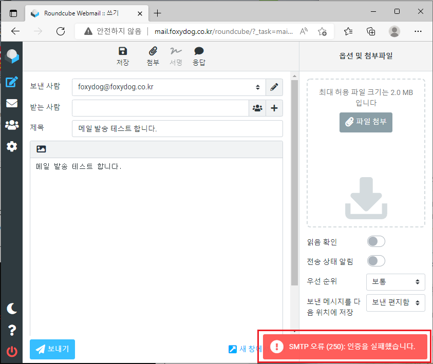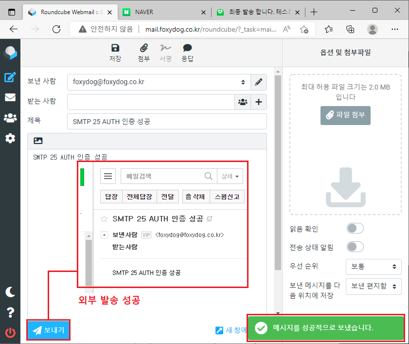 다시 RoundCube 설정을 변경 후 발송 테스트를 합니다.