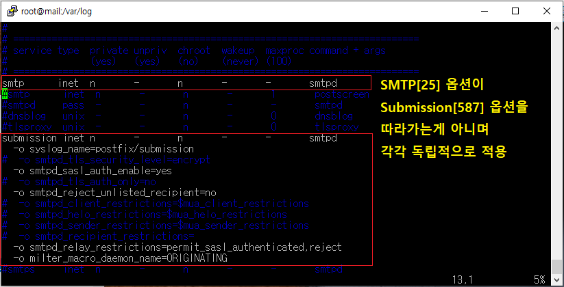 ※ 주의 사항으로 master.cf 설정 파일에서 SMTP/Submission/SMTPS 포트별로 옵션을 설정해야 한다.