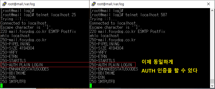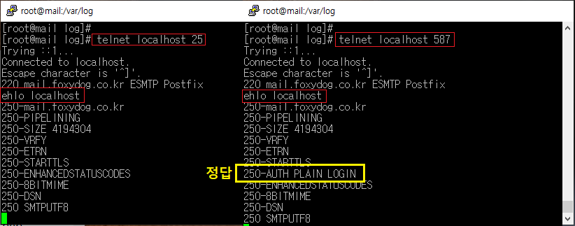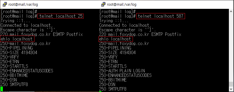 [root@localhost ]# telnet localhost 587 [연결 테스트] 220 mail.foxydog.co.kr ESMTP Postfix ehlo localhost [커맨드 명령어 입력] |
