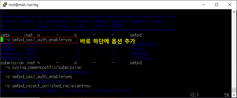 -o smtpd_sasl_auth_enable=yes [동일하게 해당 옵션을 추가]