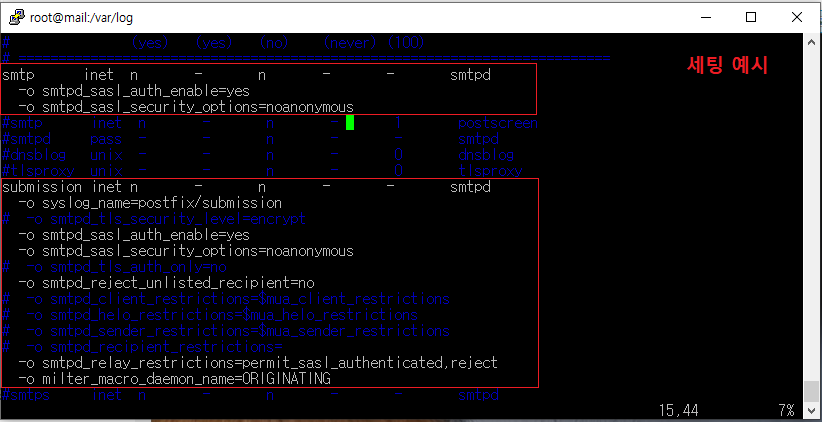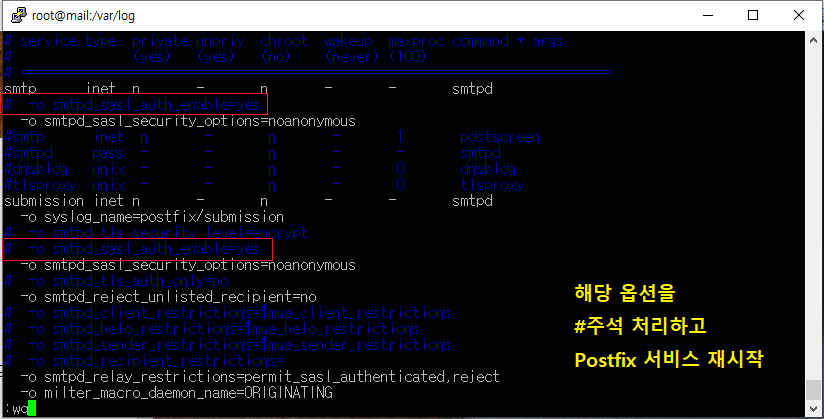 smtpd_sasl_auth_enable옵션은 사용하지 않으면 기본 설정으로 [default: no] 되어 있으므로 SMTP[25]과 submission[587]하단에 smtpd_sasl_auth_enable=yes 추가 후 Postfix 서비스를 재시작한다. 보안을 신경 쓴다면 587포트만 AUTH[인증]을 할 수 있게 하는 것을 권고합니다.