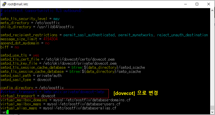 virtual_transport 설정이 $virtual_mailbox_domains=DB에 저장된 database-domains정보를 최종적으로 확인하여 수신자에게 메일을 전달(던지는)해주는 역할을 한다고 생각하면 됩니다.