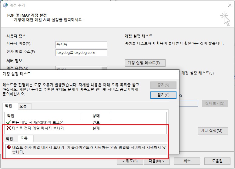 마이크로소프트 메일 아웃룩 프로그램에서 POP3/SMTP [Submission] 연결 시도 시 [25/587] 포트 인증이 허용되어 있지 않아 거부하는 모습