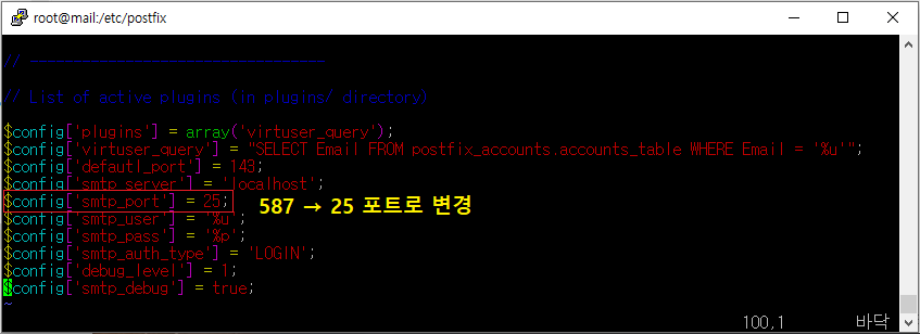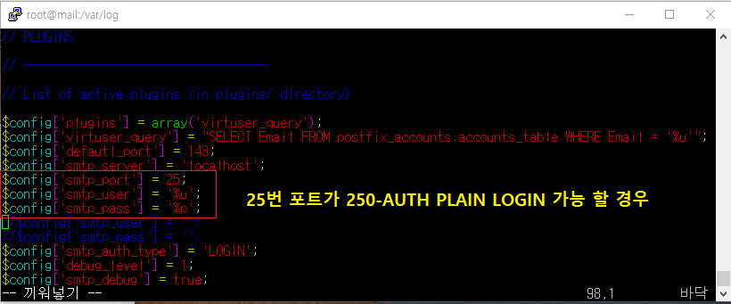 그러면 대부분이 RoundCube 메인 config.inc.php 설정에서 smtp_port 옵션을 25로 바꾸실 겁니다.