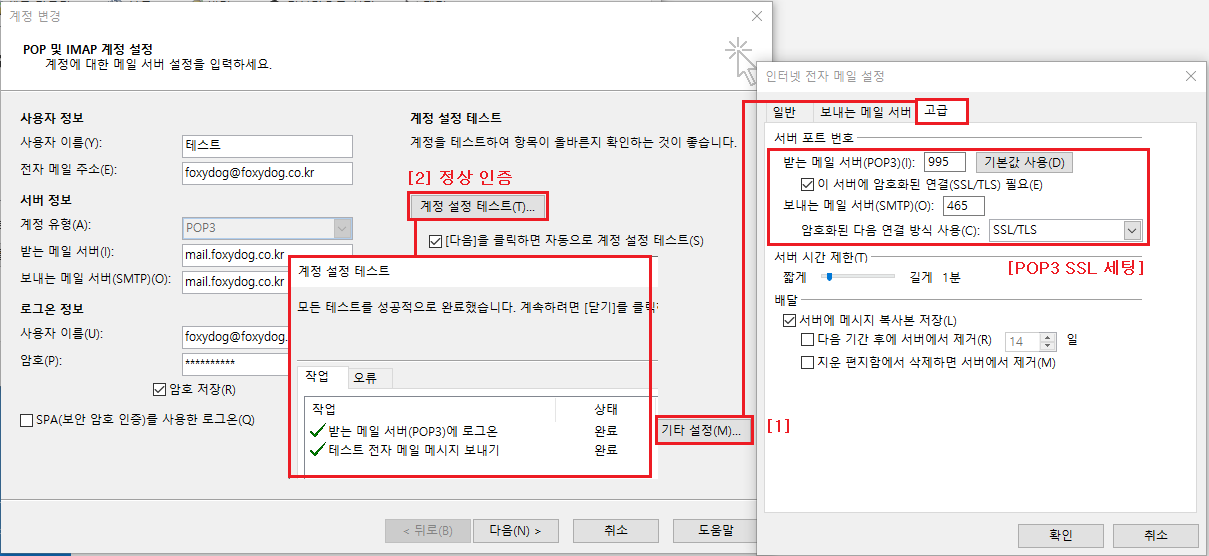 ※ 외부 메일 클라이언트를 연결을 위해 보안 포트 SSL/TLS POP3S(995)/IMAPS(993)/SMTPS(465)연결을 허용 합니다.
