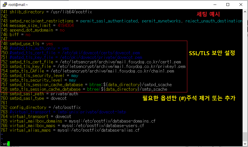 smtpd_tls_key_file = /etc/letsencrypt/archive/mail.foxydog.co.kr/privkey1.pem [인증서(KEY) 경로]