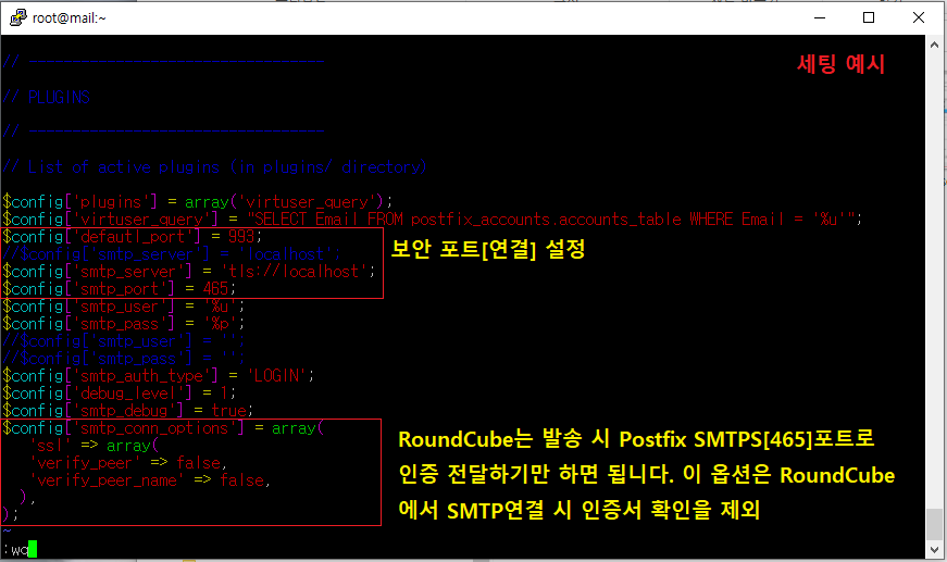 Roundcube Config 옵션 중 [smtp_conn_options]으로 SSL/TLS 수동 설정으로 추가해야 하며 저의 경우는 웹메일에서 발송 시도를 하면 Postfix SMTP(S)로 전달되면서 처리하기 때문에 [fales]만 넣었습니다. Postfix Config 설정에 이미 인증서 옵션을 적용했기 때문에 이중으로 세팅할 필요 없습니다. SSL/TLS 적용한 상태에서 SMTP연결 시도를 하면 RoundCube에서도 인증 시도를 하려고 하기 때문에 이 옵션은 필수로 넣어야 합니다.