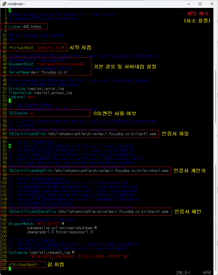 97 SSLCertificateKeyFile /etc/letsencrypt/archive/mail.foxydog.co.kr/privkey1.pem [인증서(개인키) 경로 변경]