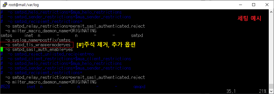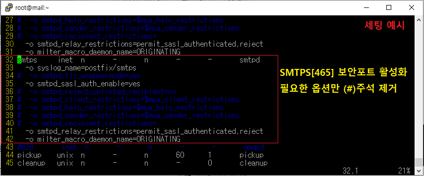 ③ Postfix 서비스 재시작 및 SMTPS[465]활성화 확인