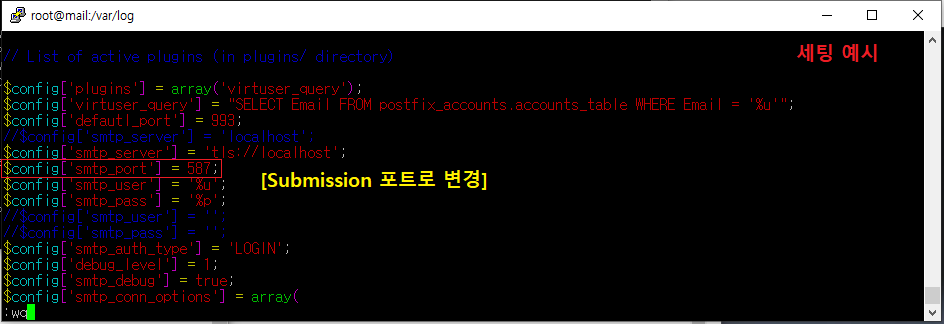 $config['smtp_port'] = 587; [submission 포트로 변경]