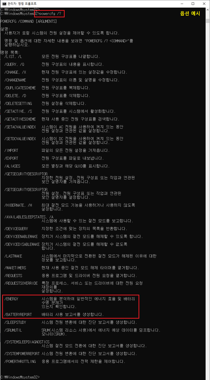 명령어> powercfg /[옵션] 형태로 입력하는 방식을 사용합니다.