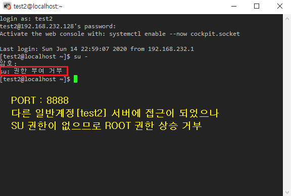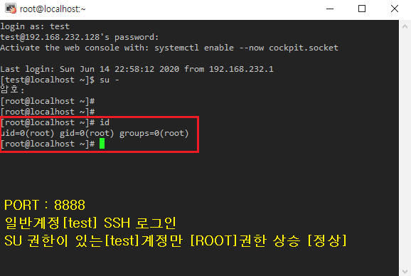 SU 명령을 허용할 계정을 wheel 그룹으로 설정[# usermod -G wheel <일반계정명>]