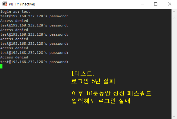 auth [default=die] pam_faillock.so authfail audit deny=5 unlock_time=600 [라인 추가]