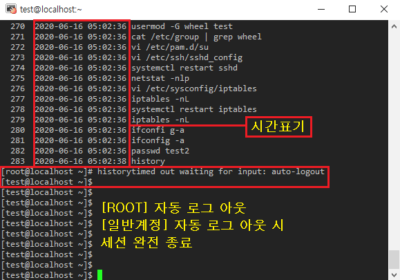 TMOUT=300 [라인추가 (초 단위)] - 세션 타임아웃 시간 설정