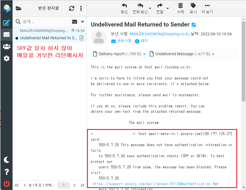 SPF 확인에 실패하여 발신자가 거부됨 |