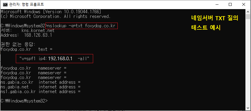 아래는 윈도우(CMD) 명령어로 TXT 등록값 확인 테스트