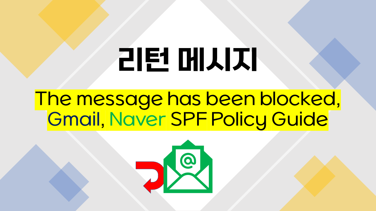 최근 구글에서 메일 정책이 변경이 되었는지 기업 메일을 사용하는 업체들 측에서 Gmail(구글 메일)로 메일을 발송하면 실패하는 경우가 많이 발생하여 확인해보니 SPF값 관련 내용이 많았습니다. Naver(네이버)의 경우도 SPF값을 등록하지 않는 도메인 메일에 대해서는 차단하는 경우가 많아 문의가 많아졌습니다. 꼭 대형 포털사이트가 아니더라도 수신 측 서버가 SPF정책을 사용하면 아래와 같은 비슷한 리턴 메시지를 받을 수 있습니다.