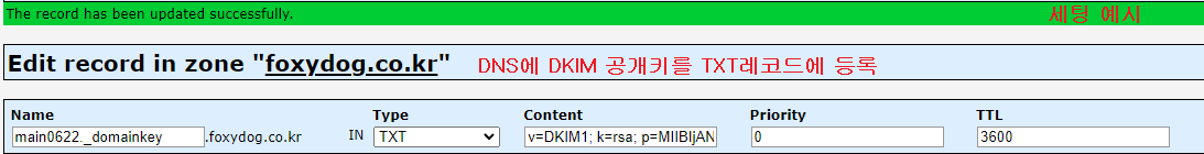 DKIM 호스트를 생성한 이름을 입력합니다 : [main0622]._domainkey.[mydomain.com]