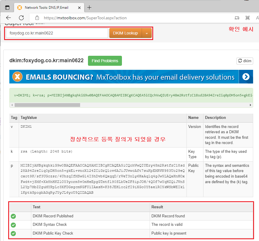 ※ 네임서버에 DKIM TXT레코드를 등록하고 인터넷에 전파되는 데는 시간이 필요할 수 있습니다.