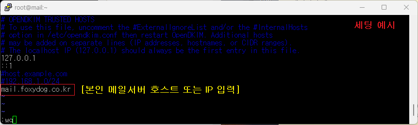 [root@ ~]# vim /etc/opendkim/TrustedHosts [구성파일 편집]