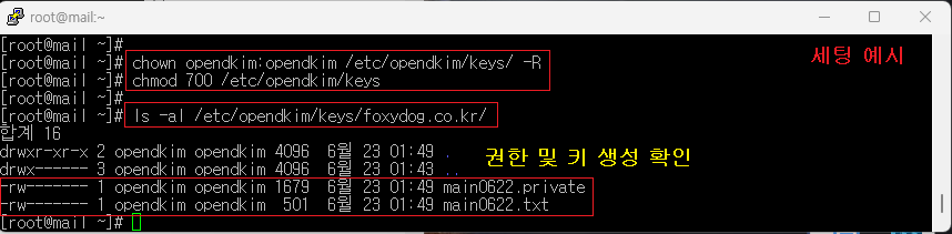[root@ ~]# ls -al /etc/opendkim/keys/foxydog.co.kr/ [확인]