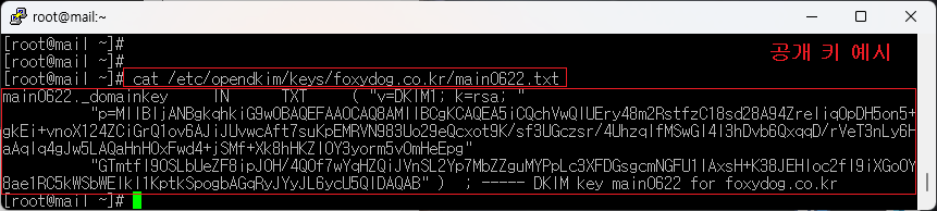 [root@ ~]# opendkim-genkey -b 2048 -d foxydog.co.kr -D /etc/opendkim/keys/foxydog.co.kr -s main0622 -v [전체 한 줄]