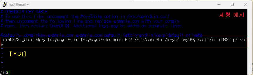 [root@ ~]# vim /etc/opendkim/KeyTable [구성파일 편집]