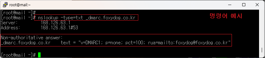 [root@ ~]# nslookup -type=txt _dmarc.mydomain.co.kr