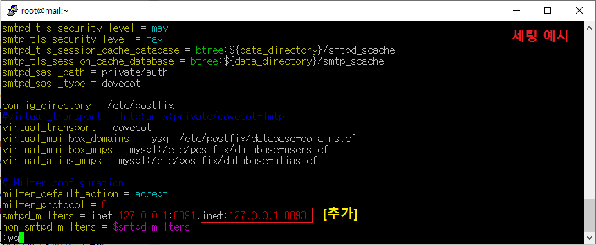 smtpd_milters = inet:127.0.0.1:8891,inet:127.0.0.1:8893 [추가]