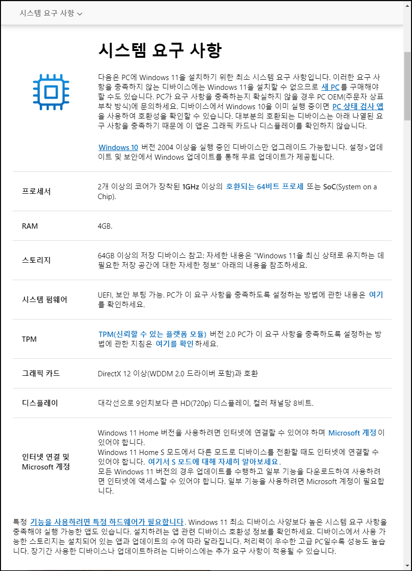 대체로 다른 부분은 문제가 되지 않지만 대부분 2가지 프로세서(CPU)와 TPM에 의해 설치 유무가 갈립니다.