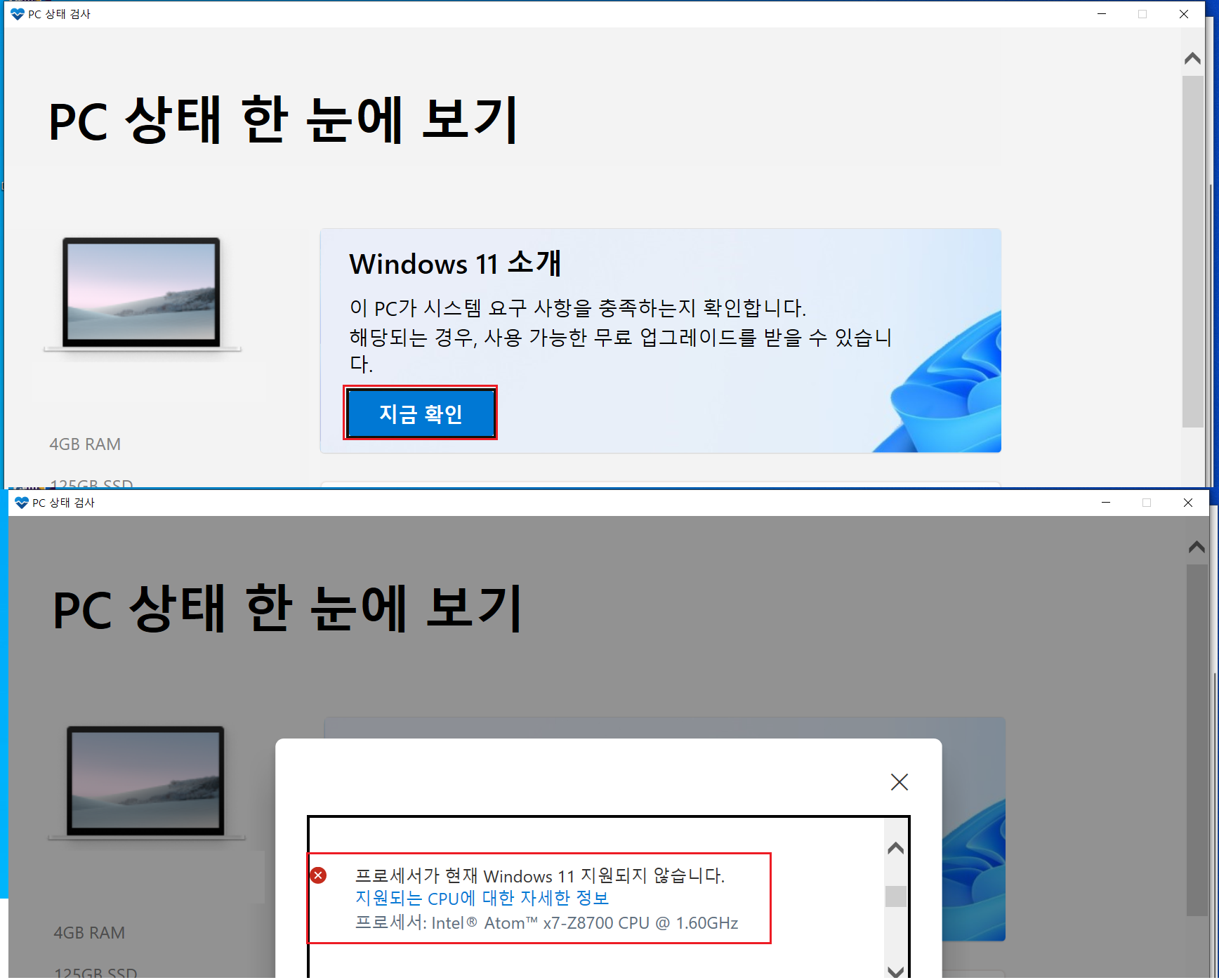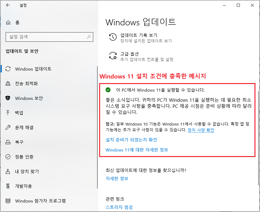 ※ Windows 11 설치 조건에 충족한 메시지