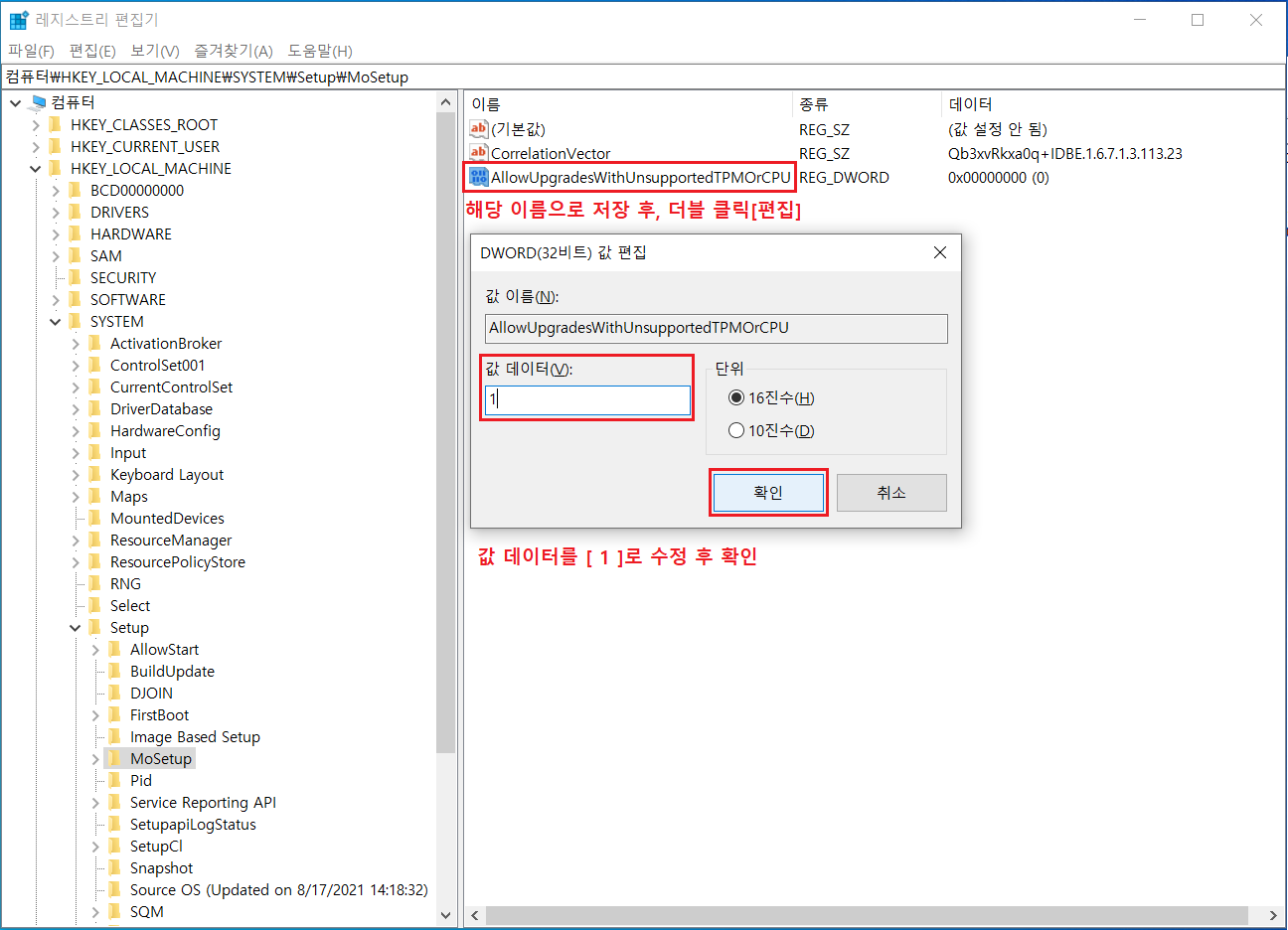 AllowUpgradesWithUnsupportedTPMOrCPU 이름 저장 ▷ 더블 클릭[편집] ▷ 값 데이터 1로 수정 후 확인