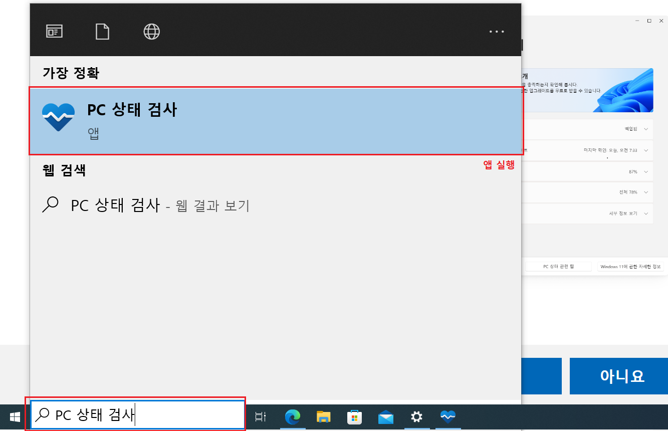 ◇ 검색 ▷ PC 상태 검사[앱] 실행 ▷ [지금 확인] 클릭