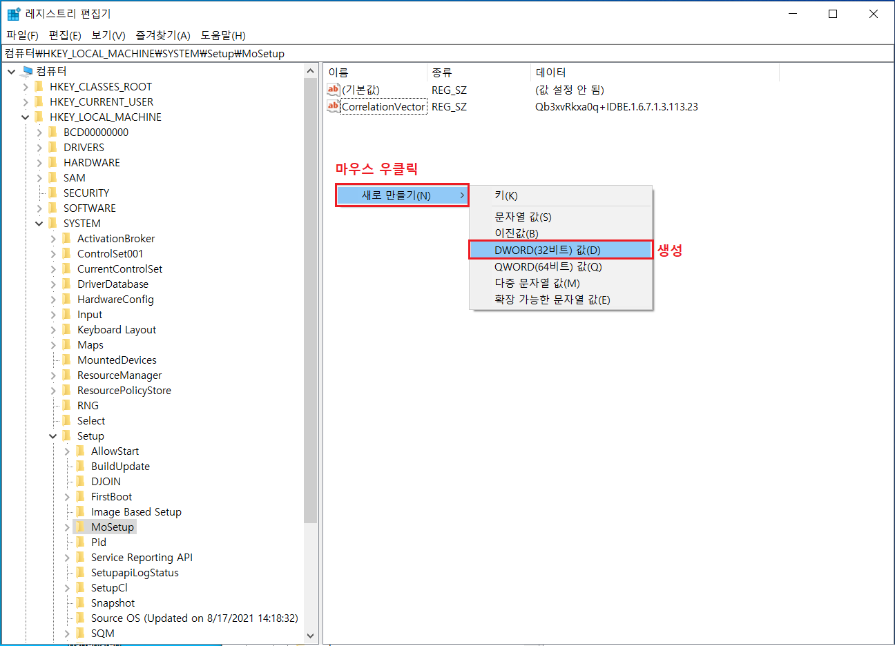마우스 우클릭 ▷ 새로 만들기 ▷ DWORD(32비트) 값 클릭 생성