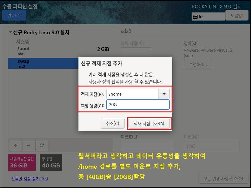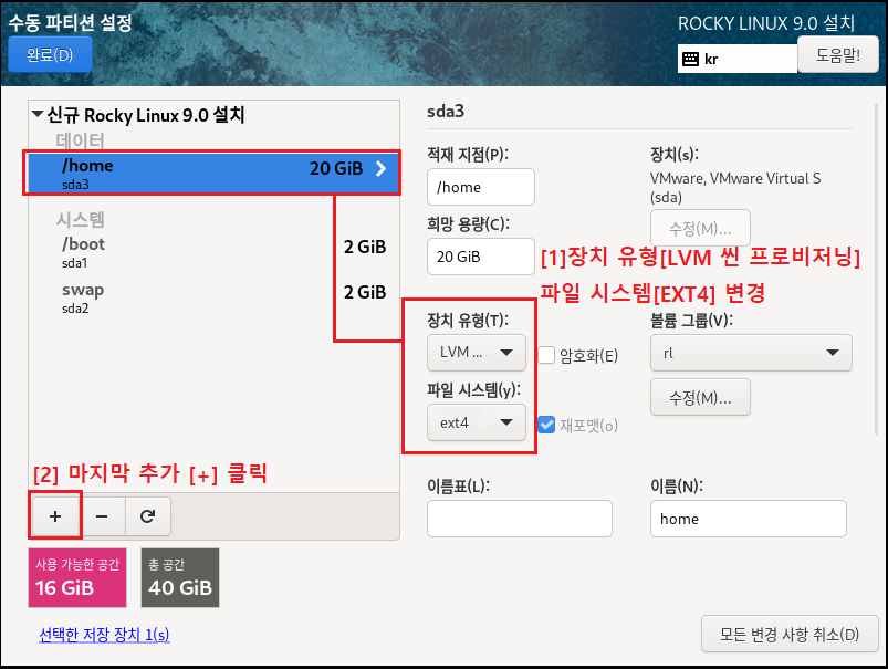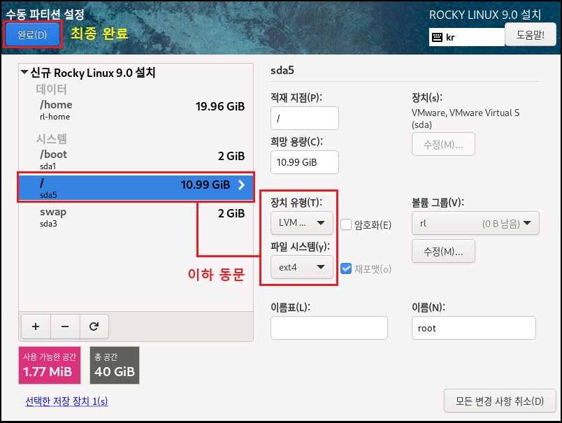 ◇ 파일 시스템[EXT4] , 장치 유형[LVM]으로 설정하는 이유는 속도나 효율적으로 디스크를 사용 및 관리하기 위해서입니다. 이제 가상화 솔루션에서도 많이 안정화되었으며 여러모로 특징이 많으므로 기본적으로 사용하는 게 좋습니다. 수동으로 설정하는 이유도, 개발 및 시스템 관리자가 될 경우 OS를 설치할 때 소프트웨어를 편하게 관리하기 위해 파티션 별로 용량을 나누고 볼륨 그룹, 레이블, 이름 등으로 구분할 수 있게 하는 연습을 하는 게 좋습니다.