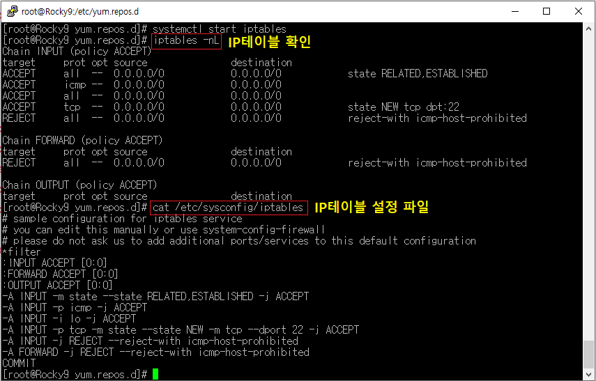 [root@]# dnf install -y iptables-services [iptables 서비스 관련 패키지 설치]