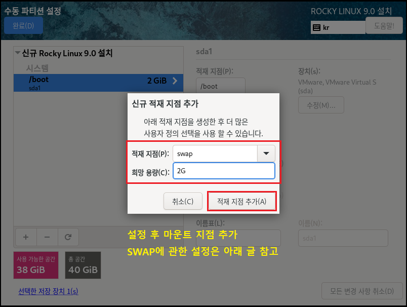 ◇ SWAP은 일종의 메모리 확보라고 생각하시면 될듯합니다. 하드디스크의 일부를 마치 메모리처럼 사용할 수 있게 해주는 기술입니다. RAM 메모리가 부족할 때 대신 SWAP 파티션을 잡아두었던 메모리를 사용합니다. 일반적으로 RAM 사용량의 2배 이상 권고 설정이라고 알고 있는 분들도 있으시겠지만 서버의 용도나 실서버 하드웨어에 들어가는 RAM 용량이 얼마냐에 따라 튜닝 작업을 해야 합니다. 하지만 저희는 테스트이며 기본적으로 1~2GB RAM으로 세팅하므로 위 동일하게 하시고 넘어가면 됩니다. 하드디스크의 용량을 사용하기 때문에 충분히 용량을 확인하고 설정하시기 바랍니다.