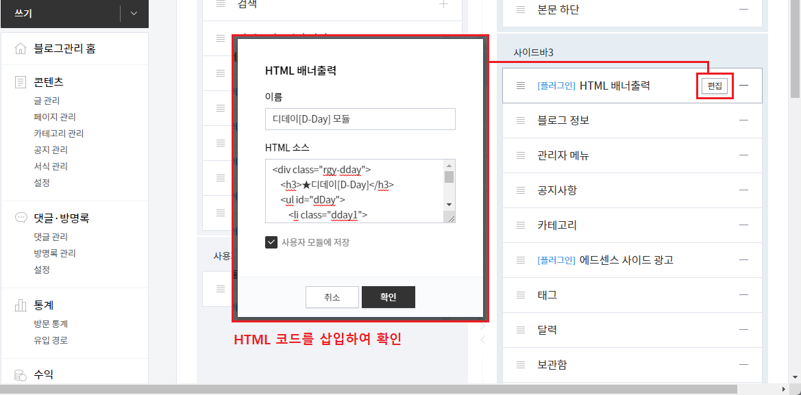 필자는 티스토리 관리자 꾸미기 [사이드바]에 HTML 배너 출력으로 등록하려고 합니다.