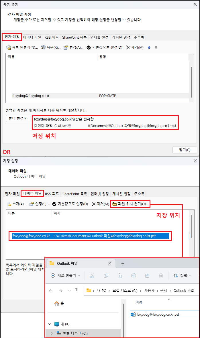 POP3와 동일하기 해당계정의 파일 위치 열기를 하시면 확인이 가능합니다.
