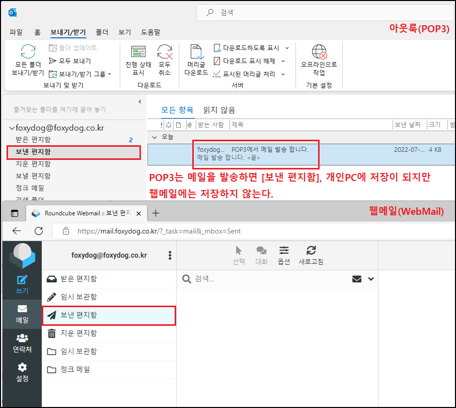 문의가 많은 것중에 하나가 "아웃룩에는 메일이 있는데 웹메일에는 메일이 없다"인데 이 문의는 없는 날이 없습니다. 1번의 연장선으로 메일을 한번 가져오면 끝이며 개인 PC에만 저장을 하기 때문에 웹메일에서 메일을 삭제하면 아웃룩에만 메일을 보관하고 있습니다. 반대로 메일을 발송을 하면 [보낸 편지함]에 메일이 저장이 되는데 웹메일에는 저장하지 않습니다.