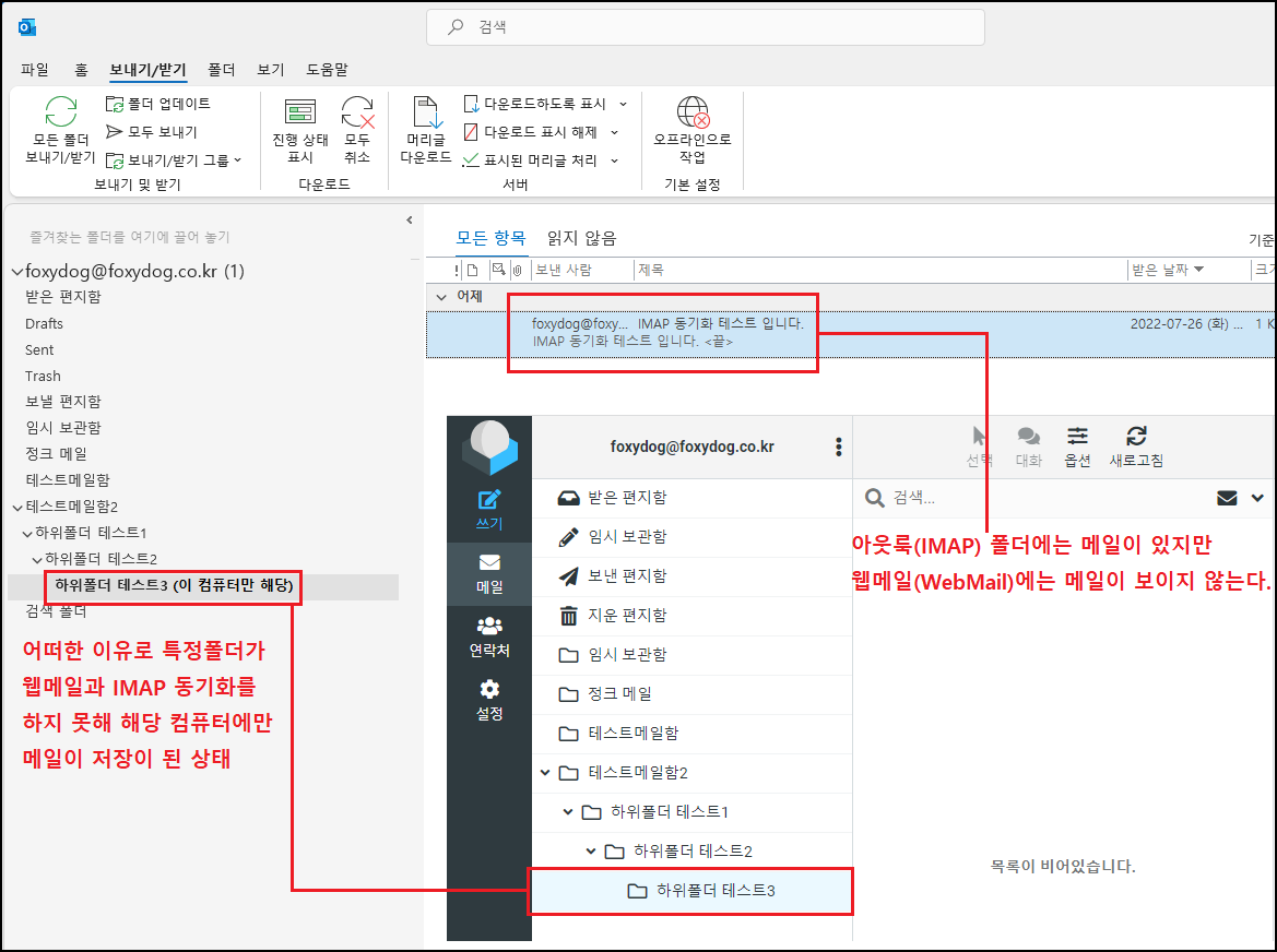 또한 IMAP을 사용하다보면 변수가 많이 발생하는데 그중 하나가 (이 컴퓨터만 해당) 메시지입니다. 이 메시지가 보인다면 어떠한 이유로 웹메일 서버와 동기화를 하지 못하고 개인 PC에만 메일이 저장된 상태라는 뜻입니다. 만약 동기화하지 않은 상태에서 아웃룩에서 메일을 삭제하면 그대로 메일이 없어진다고 생각하시면 됩니다. 본문에 있는 메일을 동기화 가능한 폴더에 이동 후 서버에 업로드가 확인이 되었을 때 조치하는 방향으로 가는 게 좋습니다.