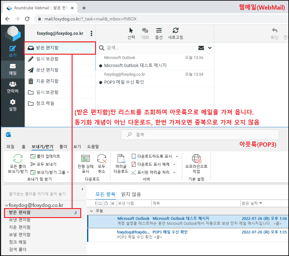 즉, 웹메일이랑 동기화를 하는 게 아닙니다. 웹메일의 [받은 편지함]에서 메일을 가져오면 아웃룩 프로그램 [받은 편지함]으로 가져오는 게 끝입니다. 다른 외부적인 요청은 일절 하지 않습니다. 간혹 중복 수신이 발생한다는 문의가 접수가 되는데 이 부분은 나중에 따로 포스팅으로 언급하겠습니다.