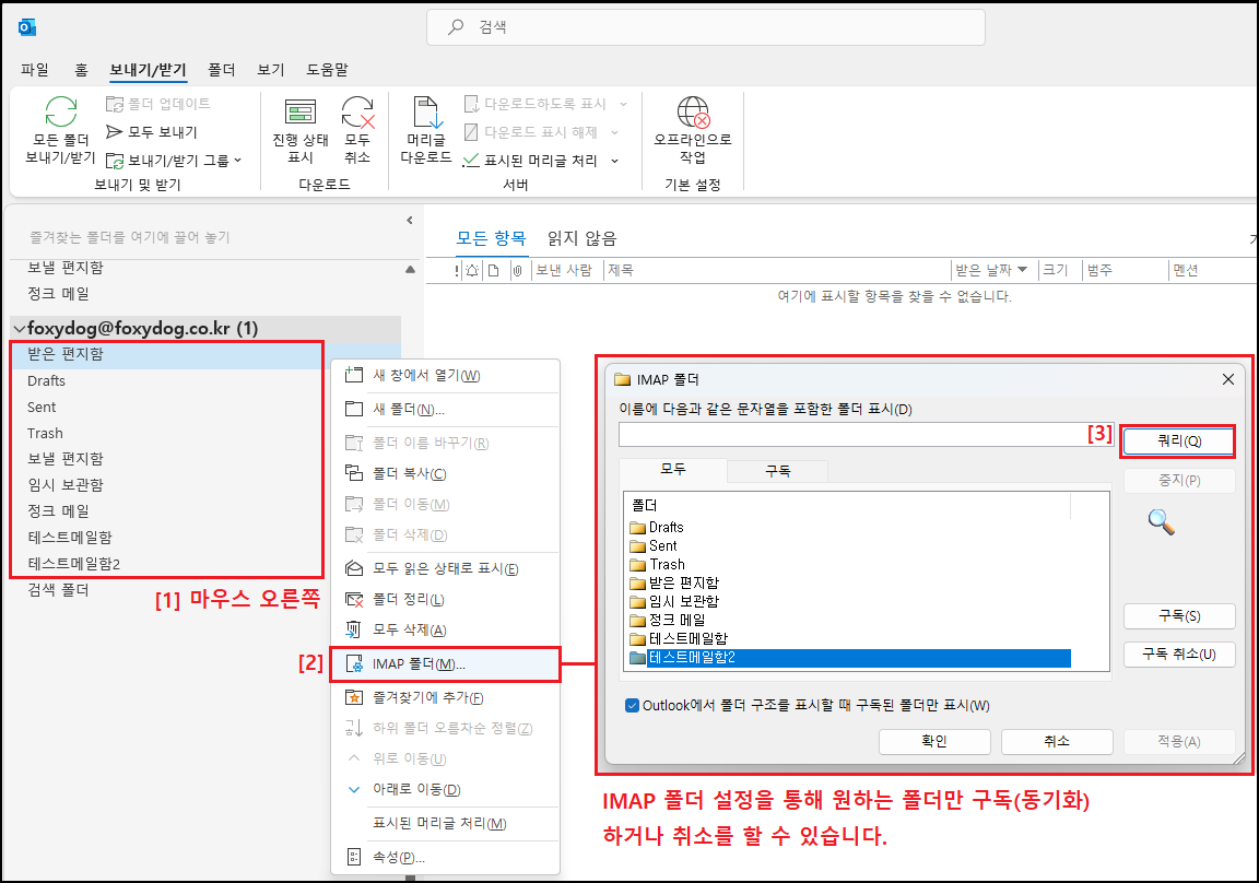 ② 아웃룩의 IMAP은 특정 폴더만 동기화(쿼리)가 가능하다.