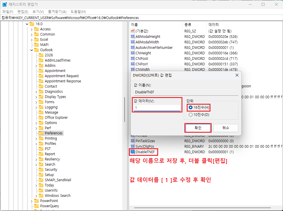DisableTNEF 이름 저장 ▷ 더블 클릭[편집] ▷ 값 데이터 16진수 [ 1 ]로 수정 후 확인