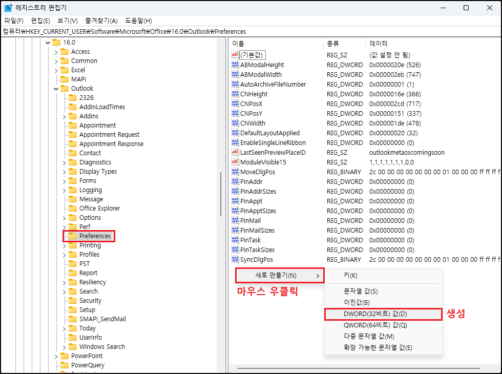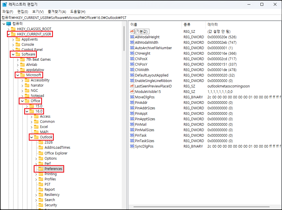 | Outlook 2016 이상 | HKEY_CURRENT_USER\Software\Microsoft\Office\16.0\Outlook\Preferences |