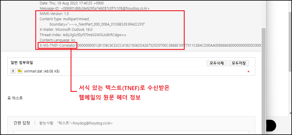 첨부한 이미지를 확인하시면 원문 헤더 정보에 MIME 유형이 X-MS-TNEF 형태인 것을 확인할 수 있습니다. 일반적인 웹메일 RFC규격은 HTML/일반 텍스트(TEXT)를 사용합니다.