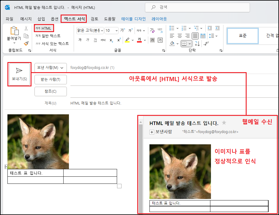 아웃룩 발송자가 텍스트 서식이 「HTML」 선택하여 발송을 하고 있는지 확인하시면 됩니다. 해당 서식으로 발송한 메일은 웹메일 수신에서도 정상적으로 HTML로 인식하여 본문에 표시가 되고 있습니다.