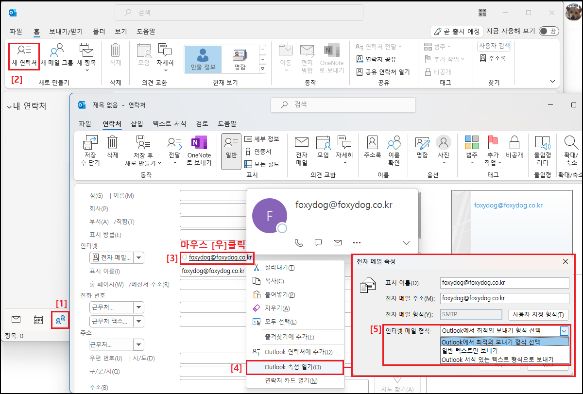 [연락처] ▷ [새 연락처] 또는 [기존 연락처] ▷ [전자 메일 계정] 마우스 우클릭 ▷ Outlook 속성 열기 ▶
